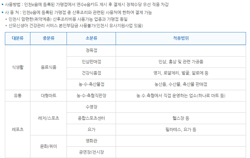 ✅ 지급방식은 연수구 e음 카드로 받을 수 있으며 사용처는 인천 e음카드에 등록된 가맹점 중 산후조리와 관련된 사용처 에한하여 결제가 가능합니다.