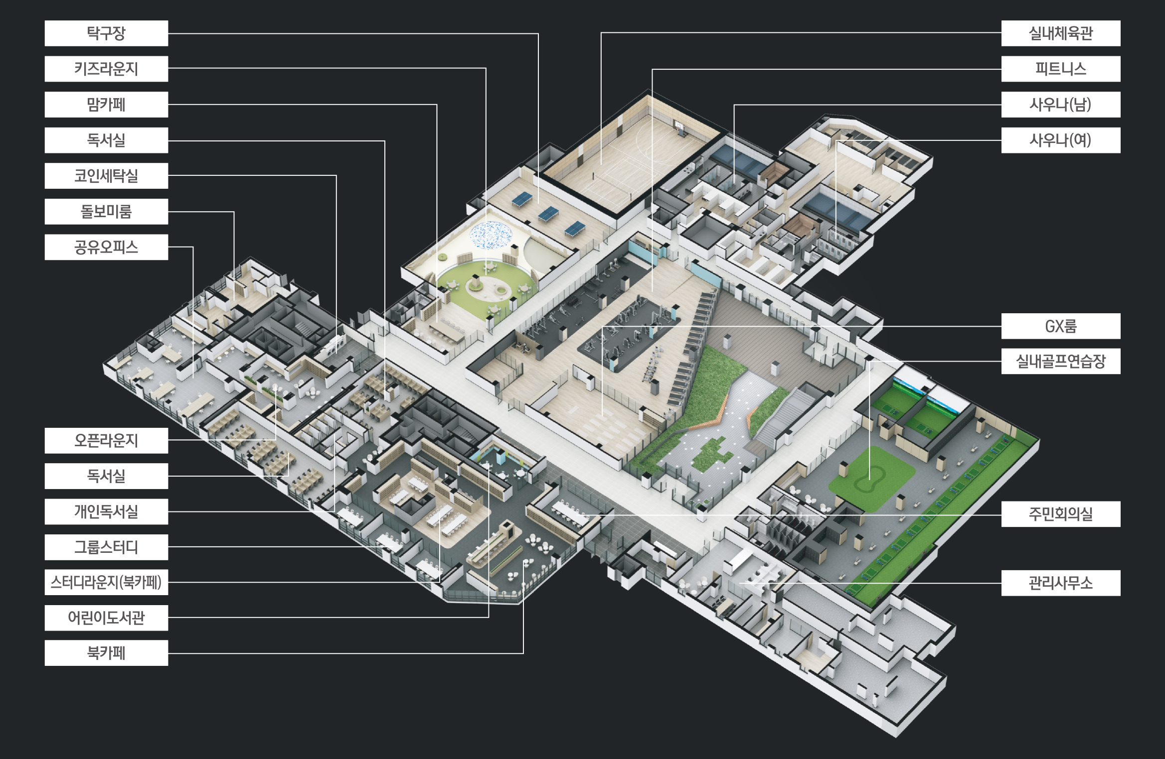 피트니스센터, 골프연습장, 도서관, 실내체육관, 어린이집, 시니어센터 등 다양한 연령대를 위한 커뮤니티 시설이 계획되어 있습니다.